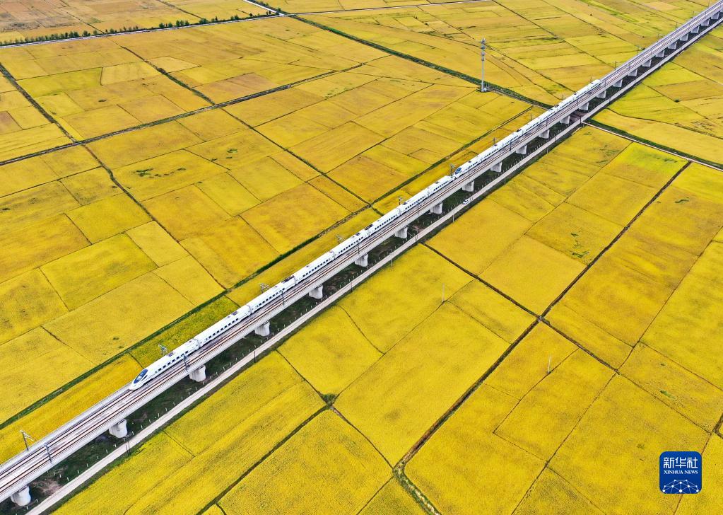 9月19日,高铁列车从吉林省公主岭市沃野间驶过(无人机照片)。新华社记者 张楠 摄