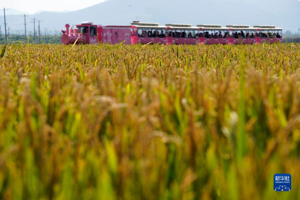 10月7日,游客在河北唐山遵化市团瓢庄乡山里各庄村乘坐观光小火车欣赏稻田秋景。新华社发(刘满仓 摄)