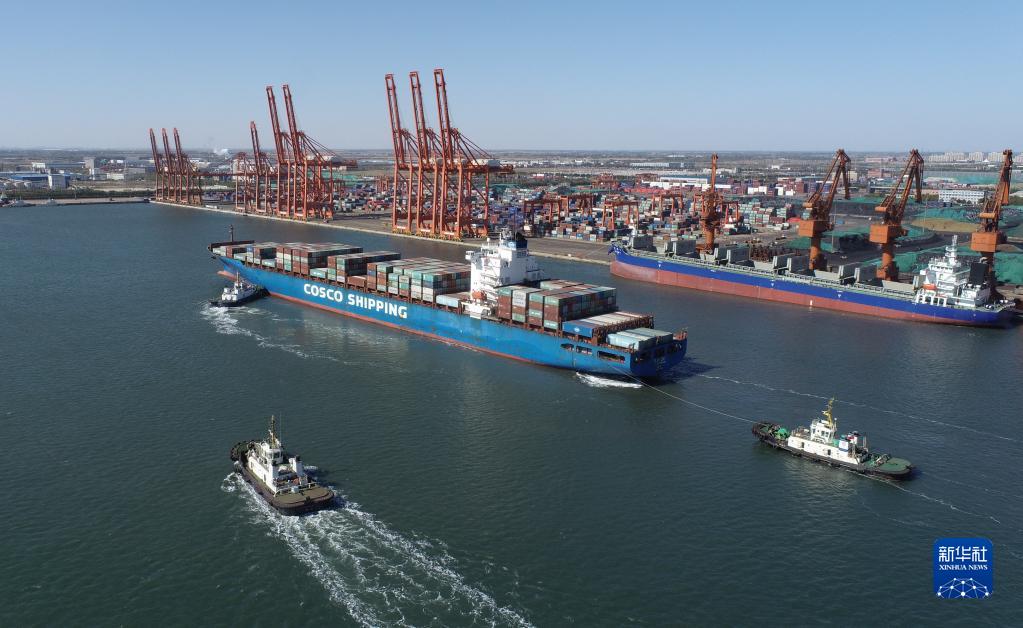 10月23日,一艘轮船向唐山港京唐港区集装箱码头靠泊(无人机照片)。新华社记者 朱旭东 摄