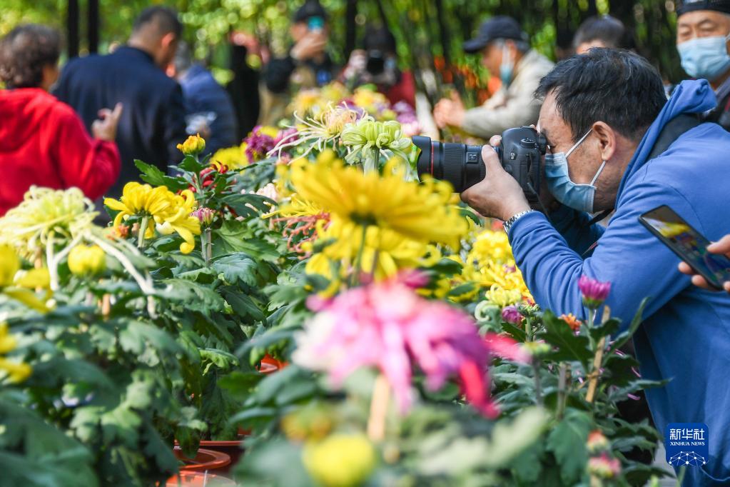 10月25日,游人在济南趵突泉公园拍摄菊花。