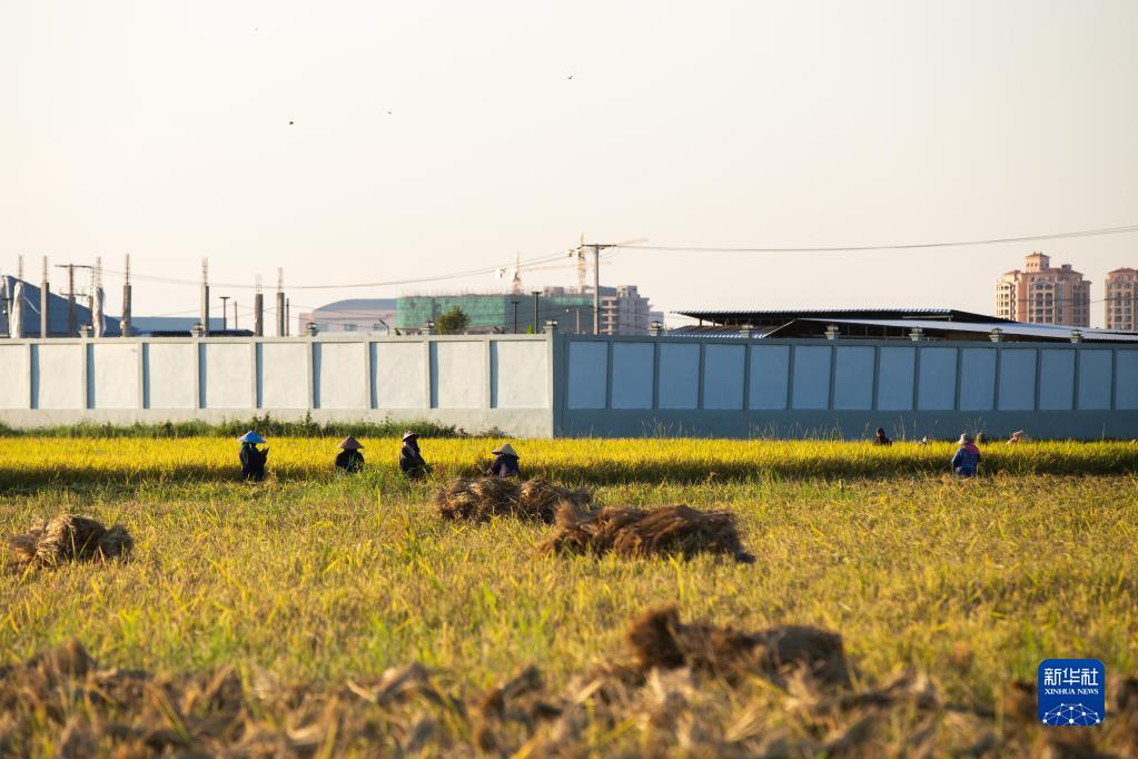 10月25日,农民在老挝万象城边的田地里收割稻谷。