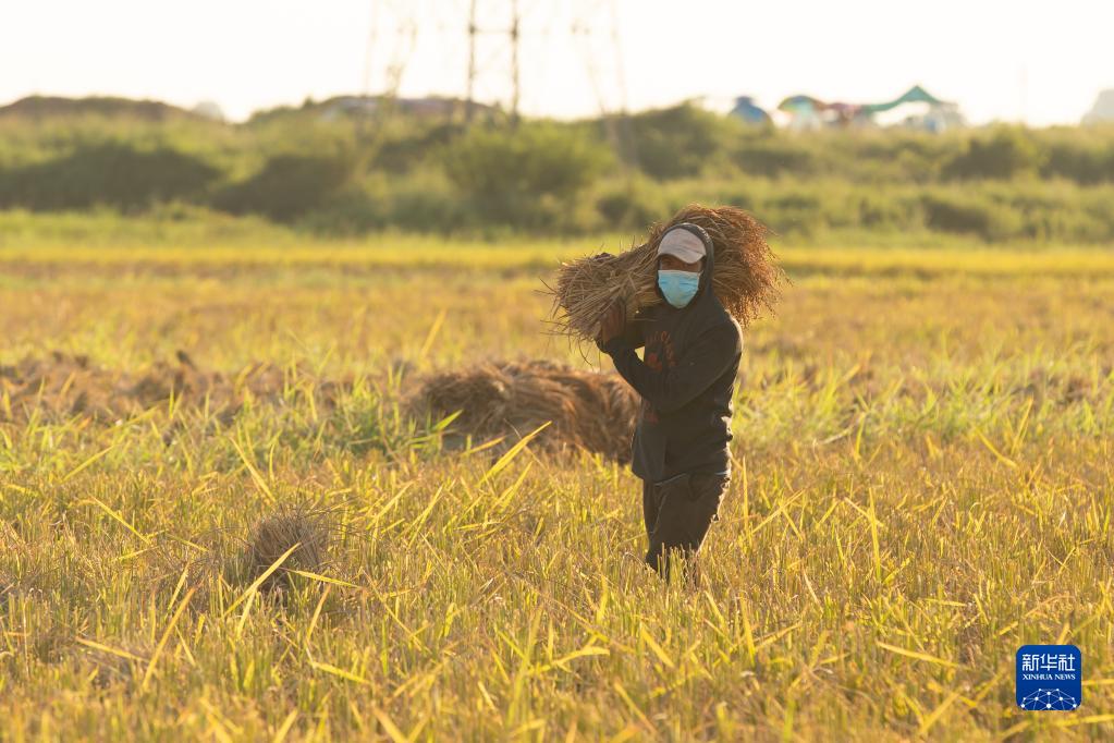 10月25日,农民在老挝万象城边的田地里收割稻谷。