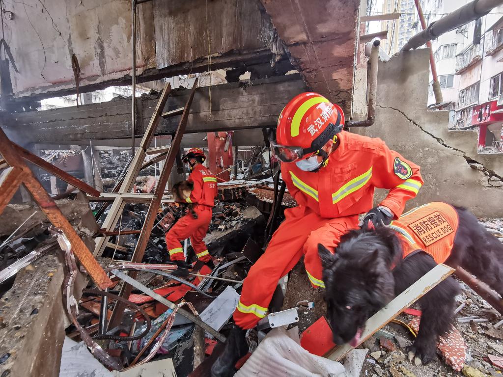 6月13日,消防救援人员和搜救犬在湖北十堰燃气爆炸事故现场搜救。新华社记者肖艺九 摄