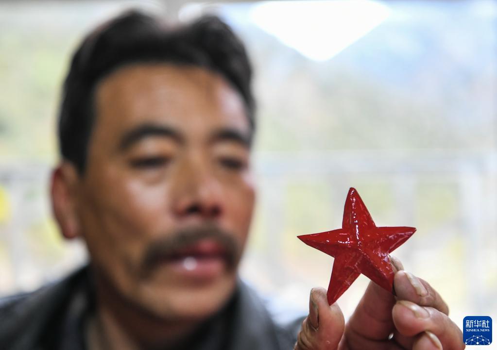 对于打乙西村老乡而言,红色的五角星一直闪耀在山谷间。桑安只要一看到红色的材质,就情不自禁地想要制作五角星。而白玛扎西现在无论走到哪,都戴着红色五角星的帽子。