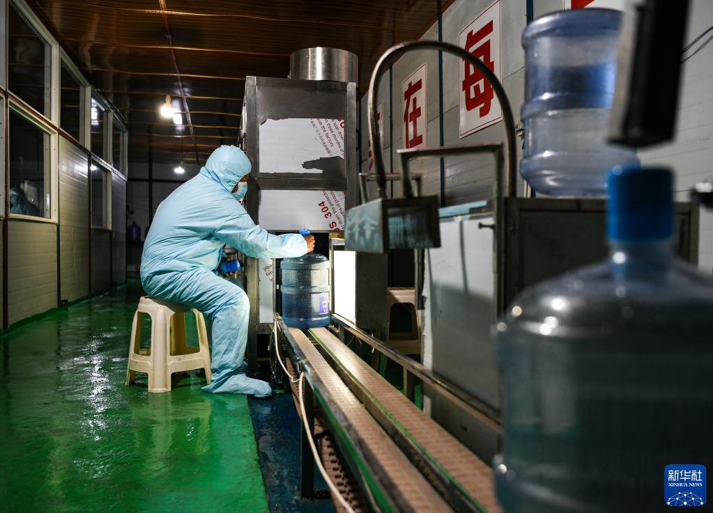 在四川省甘孜藏族自治州白玉县打乙西村,工人正在桶装水厂生产线上工作。新华社记者王曦 摄