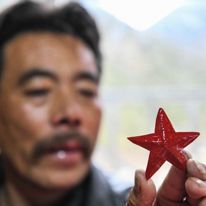 10月下旬,记者沿着当年红军在雪山草地的长征足迹,走进四川甘孜藏族自治州白玉县盖玉镇打乙西村,看见村民桑安正在制作红色的五角星。