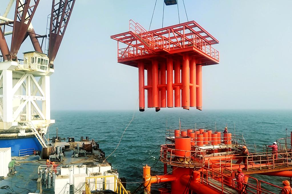 ↑2021年8月21日,中国石化胜利油田海上新建产能项目埕北208井口平台吊装安全就位。(胜利油田供图)