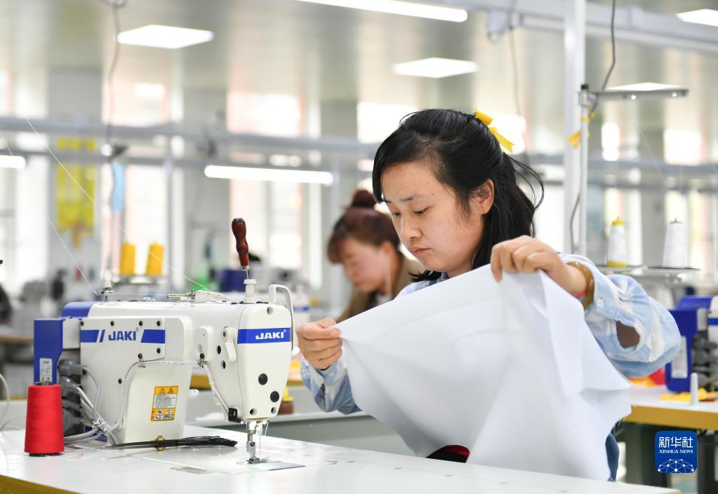 2021年4月20日,工人在位于陕西省铜川市耀州区照金镇圣源小区的社区工厂内加工服装。新华社记者 张博文 摄