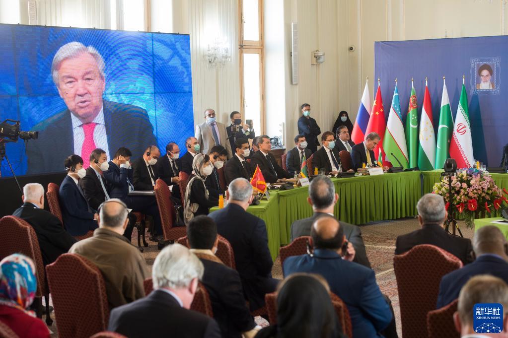 10月27日,在伊朗德黑兰举行的第二次阿富汗邻国外长会上,联合国秘书长古特雷斯视频致辞。新华社发(艾哈迈德·马利克摄)