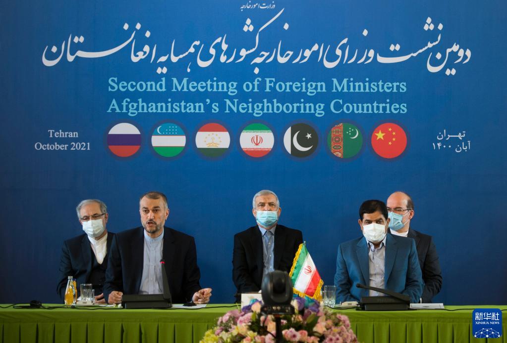 10月27日,伊朗外长阿米尔-阿卜杜拉希扬(左二)在德黑兰举行的第二次阿富汗邻国外长会上发言。新华社发(艾哈迈德·马利克摄)
