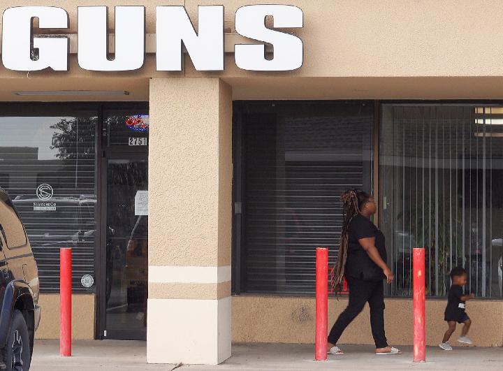8月31日,一名女子带着孩子经过美国得克萨斯州达拉斯市郊的一家枪店门口。新华社发(田丹摄)