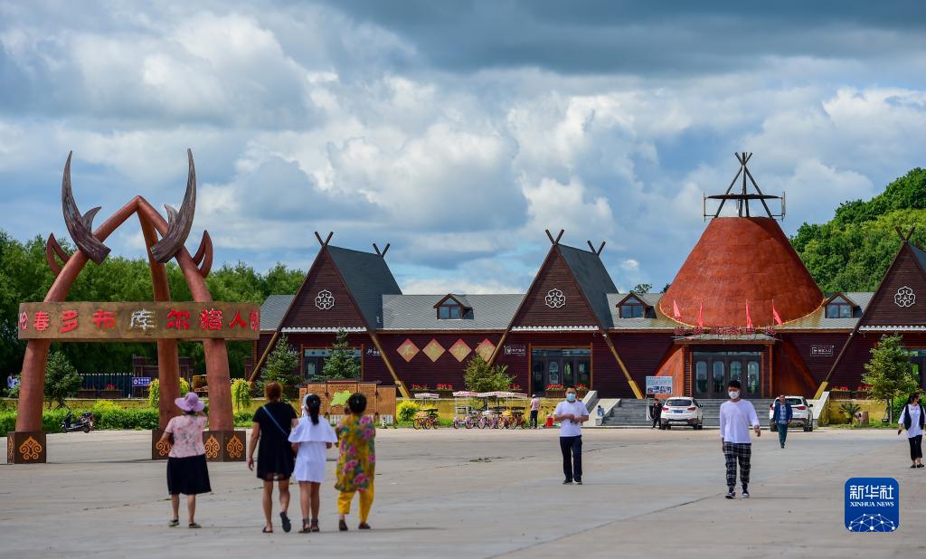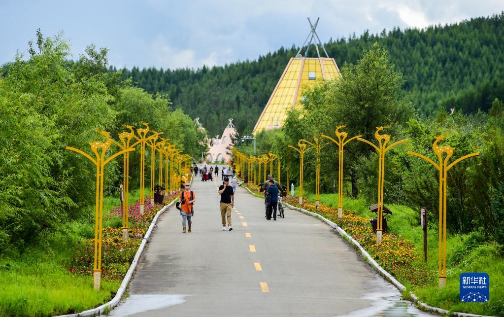 8月6日,在鄂伦春自治旗大杨树镇多布库尔猎民村,游人们在景区观光。新华社记者 连振 摄