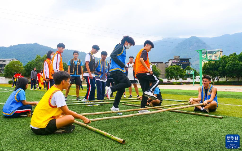 10月26日,畲族学生在福州民族中学操场跳竹竿舞。新华社发(周义摄)
