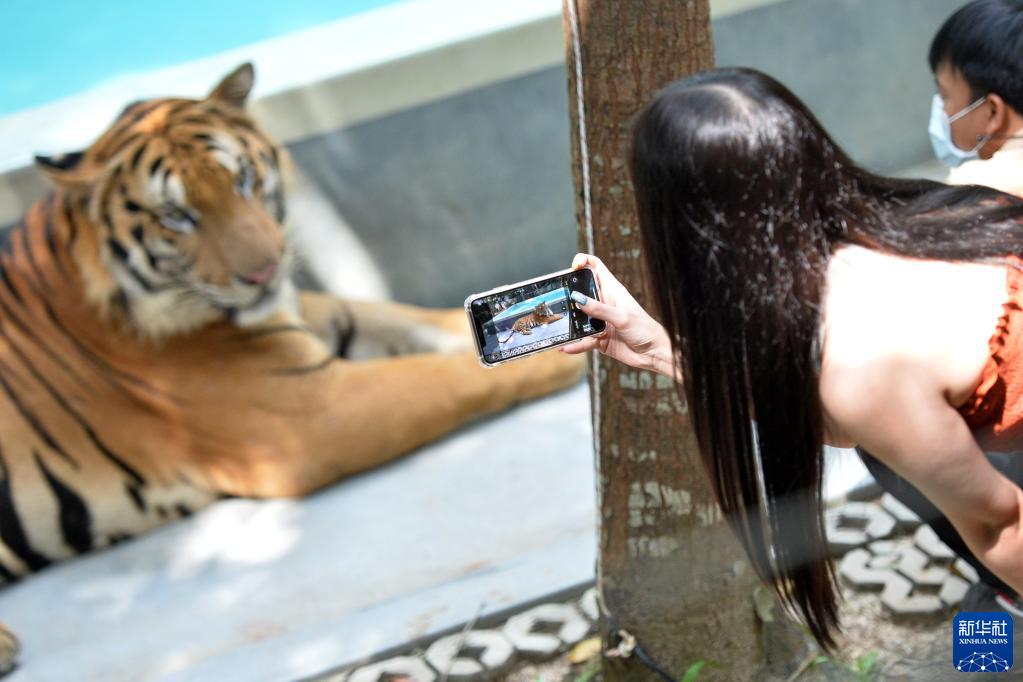 10月27日,游客在泰国芭堤雅老虎园拍摄老虎。新华社发(拉亨摄)