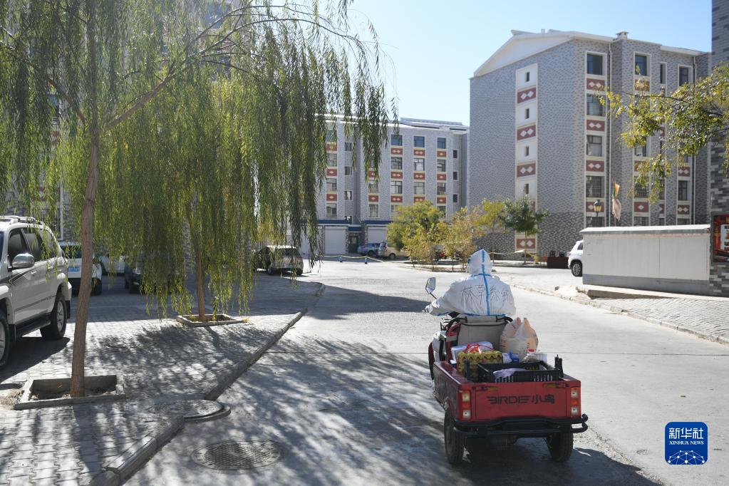 10月27日,包联干部石多仁驾驶电动三轮车在达来呼布镇居延名郡小区运送生活物资。