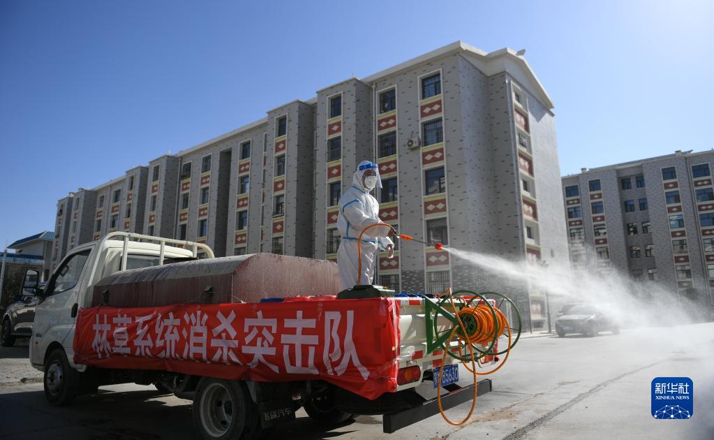 在达来呼布镇居延名郡小区,一辆卡车载着水箱来回行驶。车斗内,包联干部章保成手持水枪对小区地面进行消杀。“居家抗疫”后餐食保障尤为重要,当地在前一天对滞留人员食品需求进行统计,第二天挨家配送、免费提供。
