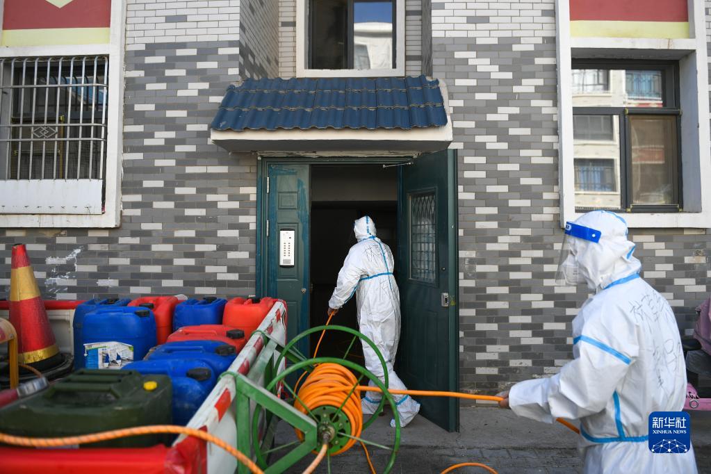 10月27日,包联干部在达来呼布镇居延名郡小区入单元楼进行消杀。