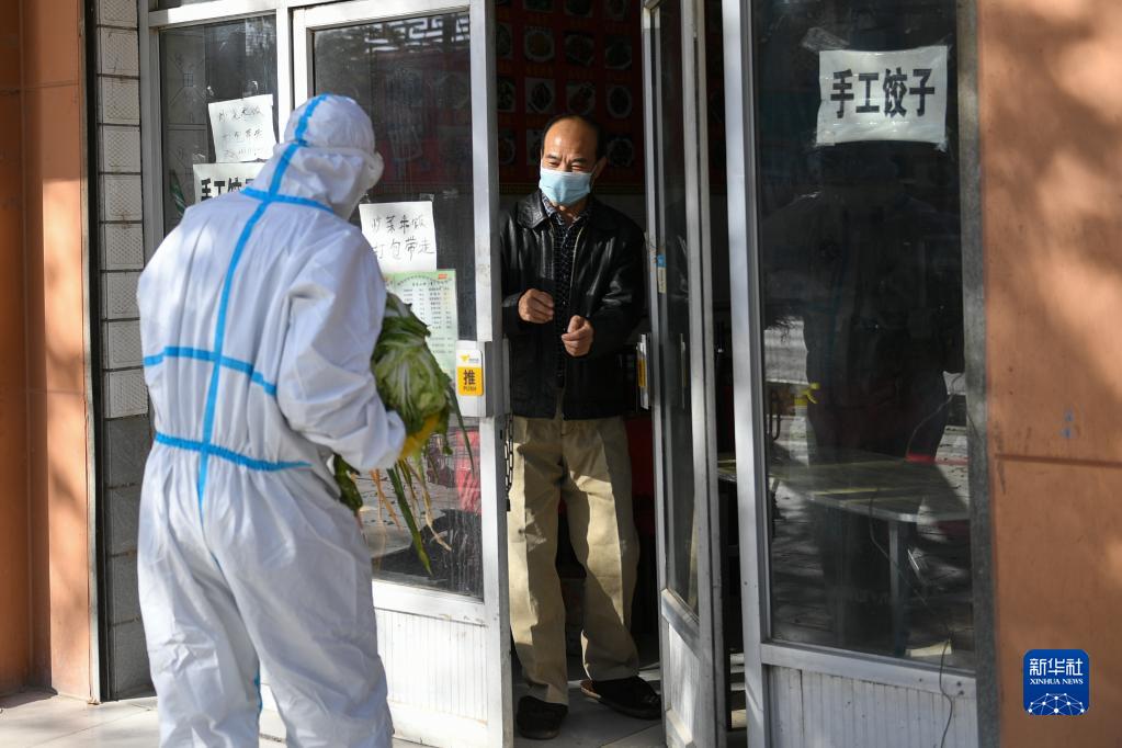 10月27日,包联干部(左)将蔬菜交给达来呼布镇街边商户。