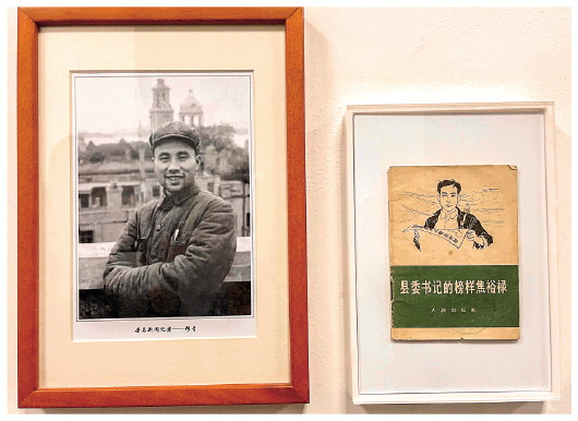 悬挂在黑龙江日报报业集团办公楼内的穆青照片和他的名篇——《县委书记的榜样——焦裕禄》(10月14日摄)。