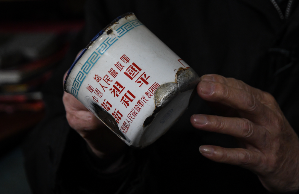△张富清珍藏了几十年、补了又补的搪瓷缸(2019年3月31日摄)。新华社记者 程敏 摄