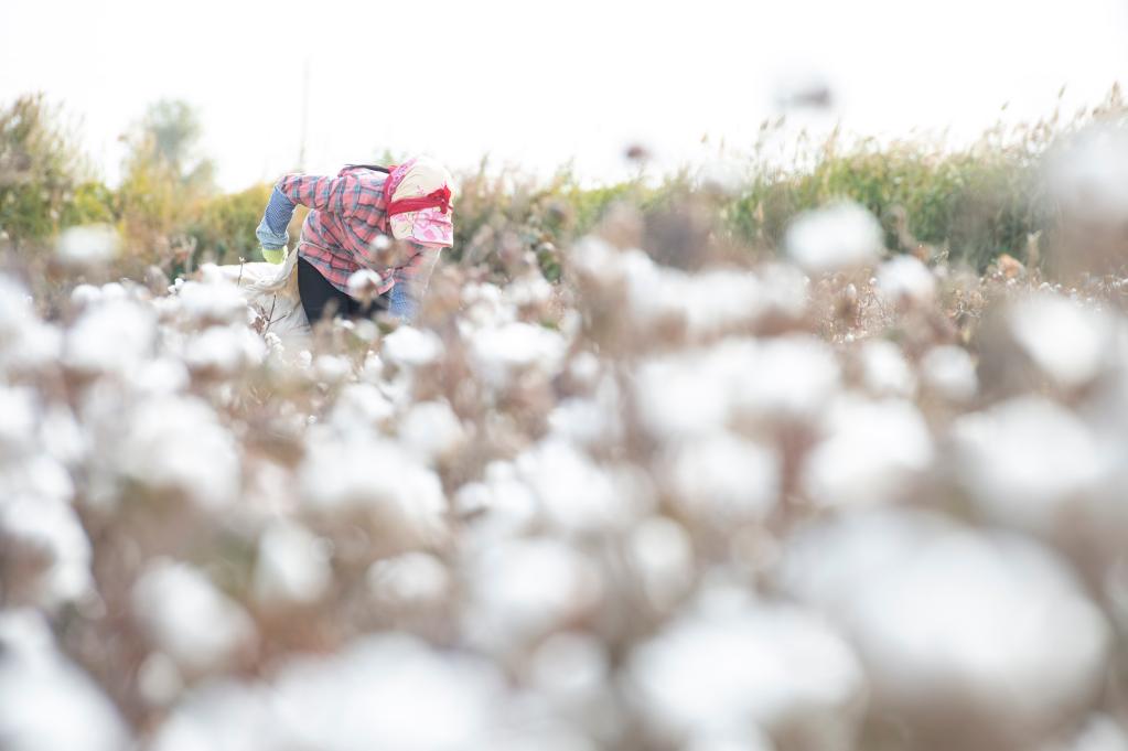 在新疆沙雅县盖孜库木乡的棉田里,孙芳红在手工采棉。(新华社记者 马锴 摄)