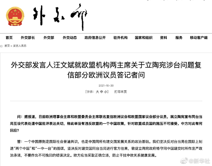 问:据报道,日前欧洲理事会主席和欧盟委员会主席联名复信欧洲议会和欧盟国家议会部分议员,就立陶宛宣布同台当局互设代表处遭中国批评表达关切,称此举没有违反欧盟的一个中国政策,针对欧盟成员国的施压不可接受。中方对此有何回应?