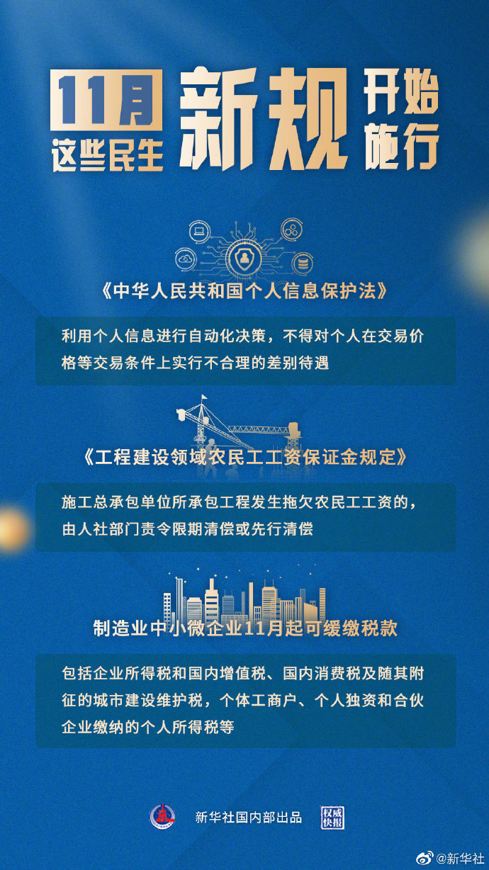 11月起,一批重要民生新规开始生效。其中,个人信息保护法11月1日起正式施行,对过度收集个人信息、大数据杀熟、滥用人脸识别技术等问题作出规制。此外,制造业中小微企业11月起可缓缴税款,工程建设领域实行农民工工资保证金制度……(记者白阳,海报设计张晨光)