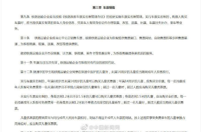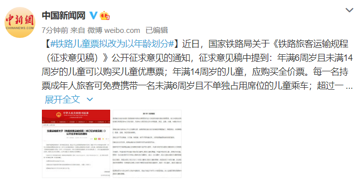 近日,国家铁路局关于《铁路旅客运输规程(征求意见稿)》公开征求意见的通知,征求意见稿中提到:年满6周岁且未满14周岁的儿童可以购买儿童优惠票;年满14周岁的儿童,应购买全价票。每一名持票成年人旅客可免费携带一名未满6周岁且不单独占用席位的儿童乘车;超过一名儿童时,超过人数应当购买儿童优惠票。