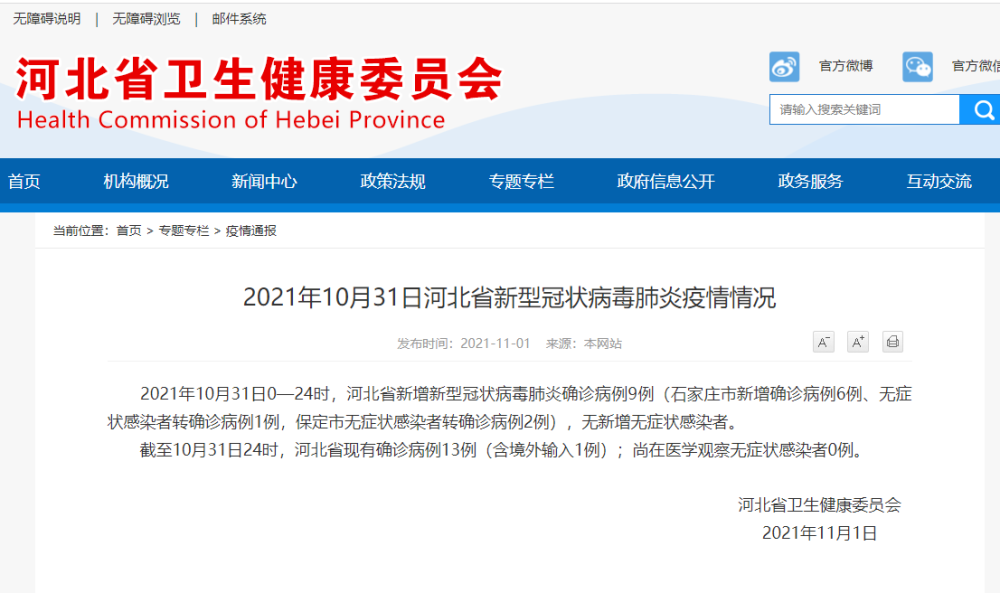 2021年10月31日河北省新型冠状病毒肺炎疫情情况