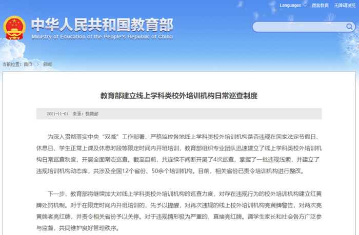 为深入贯彻落实中央“双减”工作部署,严格监控各地线上学科类校外培训机构是否违规在国家法定节假日、休息日、学生正常上课及休息时段等限定时间内开班培训,教育部组织专业团队迅速建立了线上学科类校外培训机构日常巡查制度,开展全面常态巡查。截至目前,共连续不间断开展了4次巡查,掌握了一批违规线索,并建立了违规培训机构动态库,共涉及全国12个省份、50余个培训机构。目前,相关省份已责令培训机构进行整改。