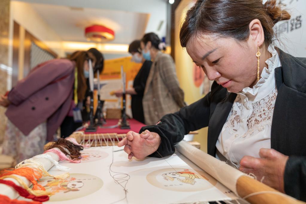 5月16日,在北京举办的首届残疾人就业服务展暨人才交流会上,一名残疾人展示刺绣技术。新华社记者才扬 摄