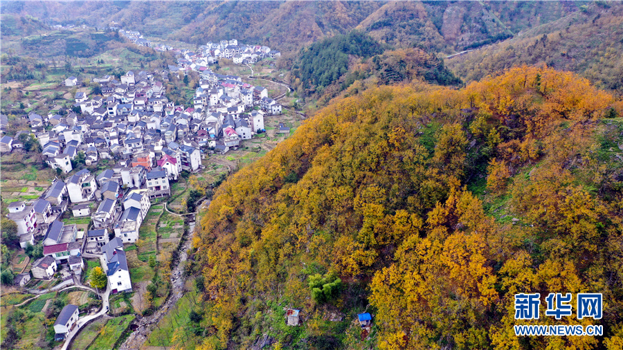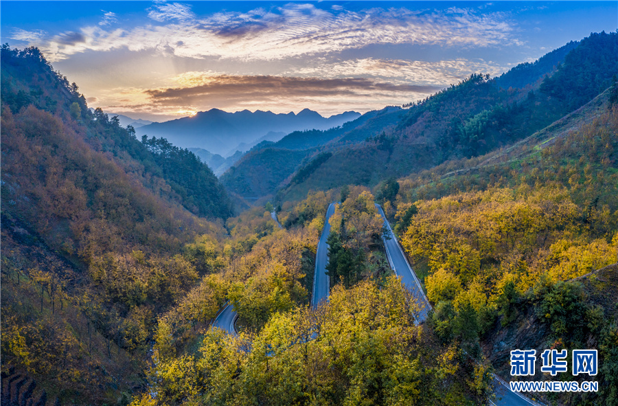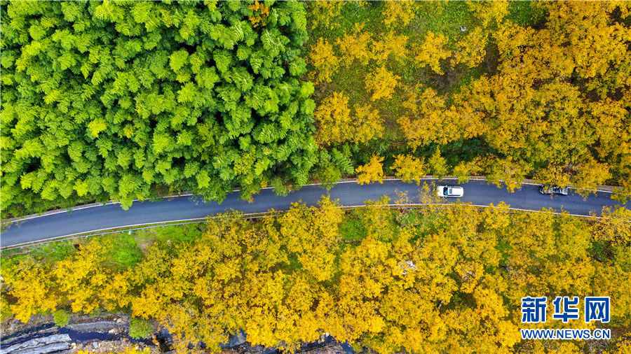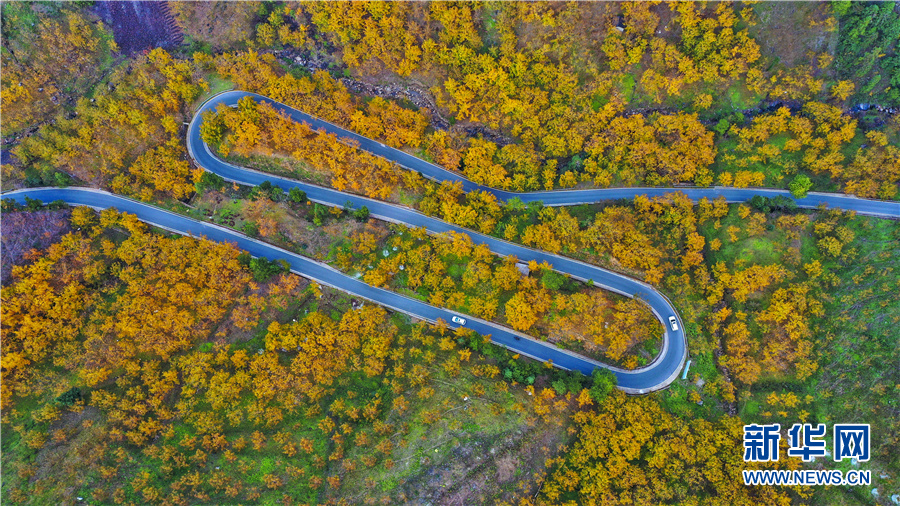 10月31日,航拍安徽省宣城市绩溪县荆州乡的盘山公路。深秋时节,这里层林尽染,金黄色的万亩山核桃林与漫山遍野的秋叶交相辉映,构成一幅幅色彩斑斓的“油画”。