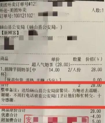 被接警员暖到的不仅是女孩。不少网友匿名点了奶茶送到公安局,并留言说:你用奶茶温暖了轻生女孩,我们想用奶茶温暖你。
