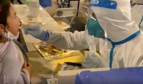 第一次测核酸的小朋友有些紧张,医务人员轻声哄着:“很快的哈,坚持一下,不要怕!”;
