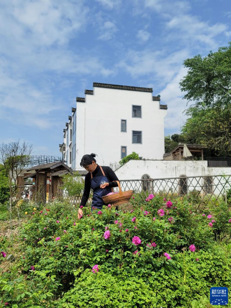4月19日,张建玲在位于安徽省黄山市徽州区的民宿院子里采摘食用玫瑰花。新华社发