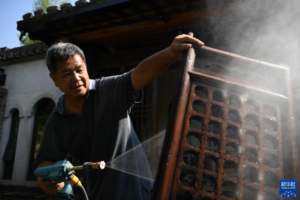 9月16日,在安徽省黄山市徽州区岩寺镇石际村,张真钢清洗收集来的旧门窗。新华社记者 张端 摄