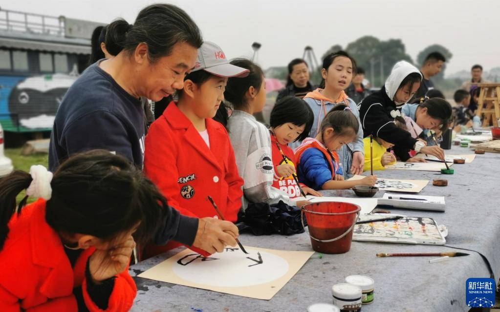 10月31日,许国良(左二)在湖南省益阳市资阳区张家塞乡富民村为当地留守儿童上美术课。新华社发(孙国基摄)