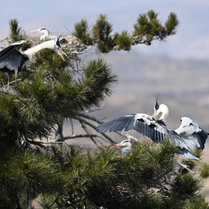 2021年3月11日,在位于吕梁山深处的山西省吕梁市方山县积翠乡,苍鹭在林间嬉戏。新华社发(刘亮亮 摄)