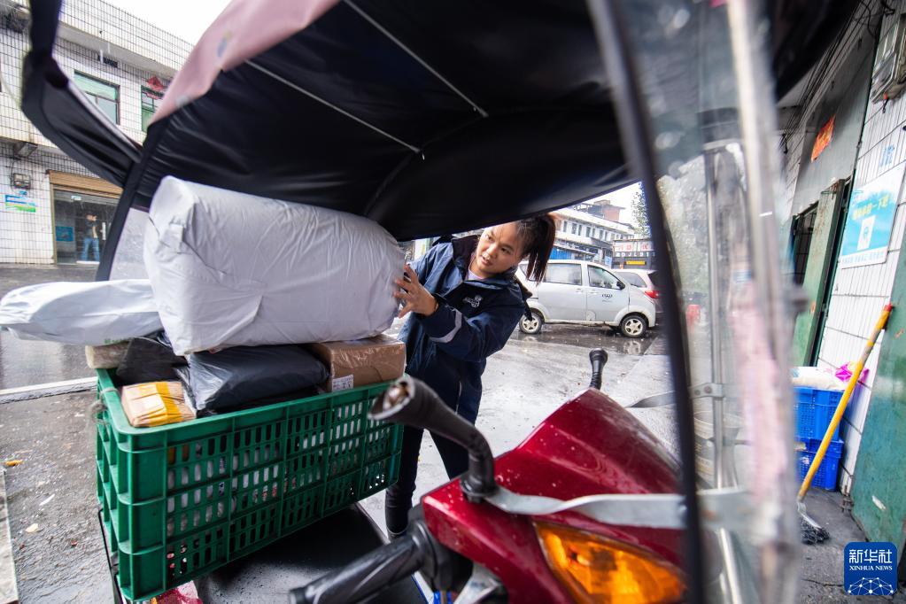 11月3日,在黄市镇新生快递乡村服务站,胡夏把准备派送的快递装车。