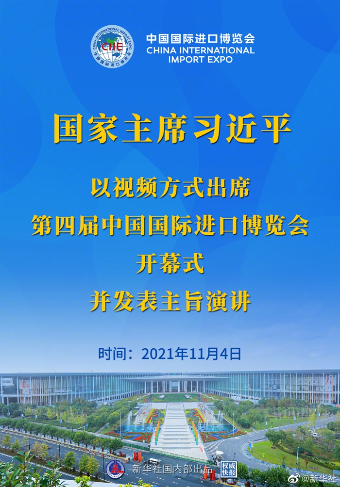 11月4日晚,国家主席习近平以视频方式出席第四届中国国际进口博览会开幕式并发表主旨演讲。