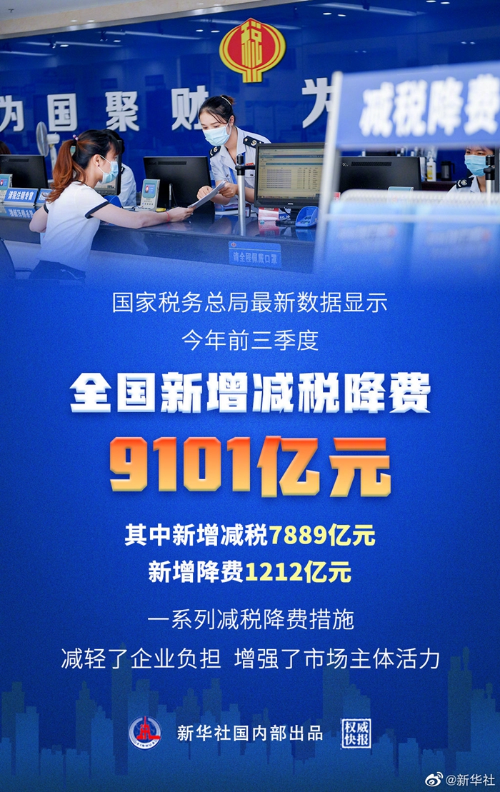 国家税务总局最新数据显示,今年前三季度,全国新增减税降费9101亿元,其中新增减税7889亿元,新增降费1212亿元。今年以来,面对复杂严峻的国内外环境,我国出台了一系列减税降费措施,减轻了企业负担,增强了市场主体活力。(记者王雨萧,海报设计苗夏阳)