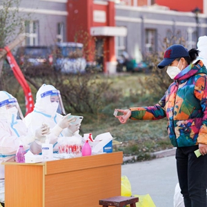 11月2日,黑河市民在一处核酸检测点准备接受核酸采样。新华社记者 王松 摄