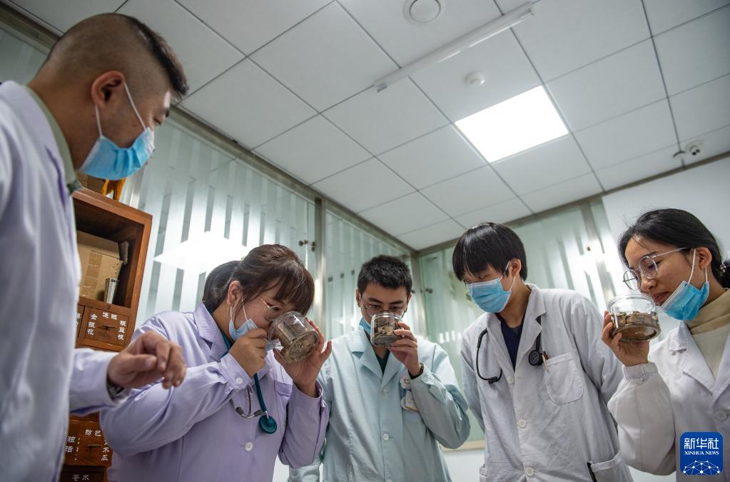 范开(左一)指导学生闻中药材的气味(10月29日摄)。