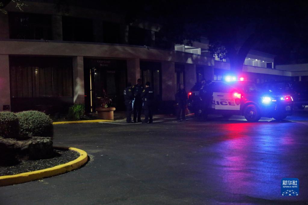 11月6日凌晨,警方人员聚集在美国休斯敦一家酒店门口。警方将这家酒店设为亲属查询失联现场观众联络点。新华社发(劳承跃 摄)