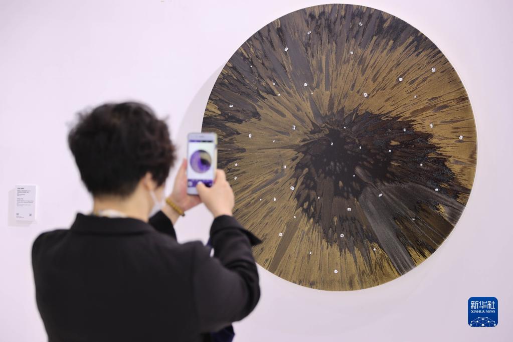 11月5日,观众在第四届进博会服务贸易展区拍摄艺术品。