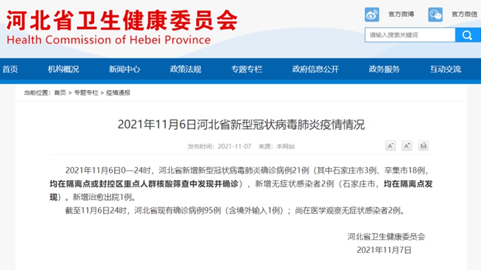 2021年11月6日0—24时,河北省新增新型冠状病毒肺炎确诊病例21例(其中石家庄市3例、辛集市18例,均在隔离点或封控区重点人群核酸筛查中发现并确诊),新增无症状感染者2例(石家庄市,均在隔离点发现)。新增治愈出院1例。