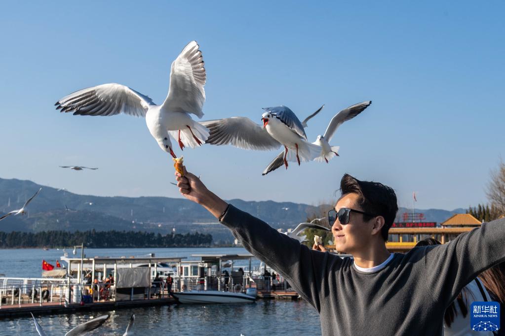 11月7日,一名男子在昆明市滇池海埂观景大道上投喂红嘴鸥。