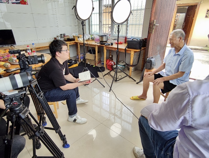 2021年6月16日,执行导演饶力文(左一)在广西百色采访“七一”勋章获得者黄文秀的父亲黄忠杰,那一天恰是黄文秀牺牲两周年的日子