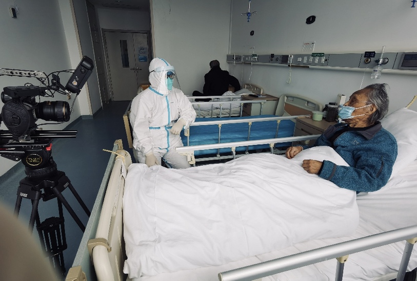 2020年4月6日,饶力文在武汉大学人民医院东院区采访拍摄“夕阳老人”