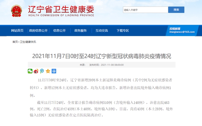 2021年11月7日0时至24时辽宁新型冠状病毒肺炎疫情情况